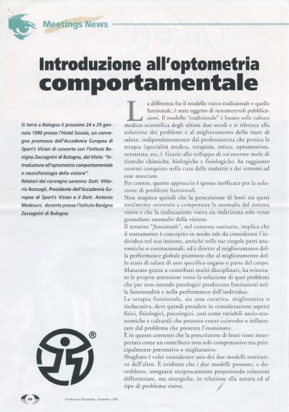 Articolo inserto in Articoli professionali,Pubblicazioni ilQuesto incontro di due giorni vuole essere un’occasione per avvicinare all’optometria comportamentale nuovi operatori e soprattutto studenti di optometria in via di formazione; è stata quindi prevista dall’Accademia Europea di Sports Vision un’attività divulgativa e didattica sinergica con le varie scuole di optometria.